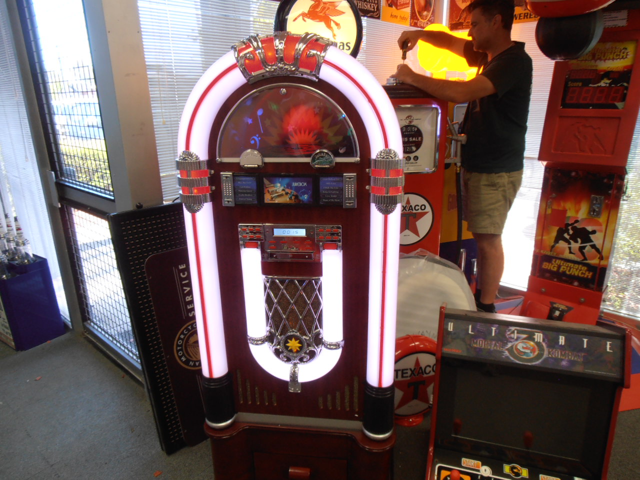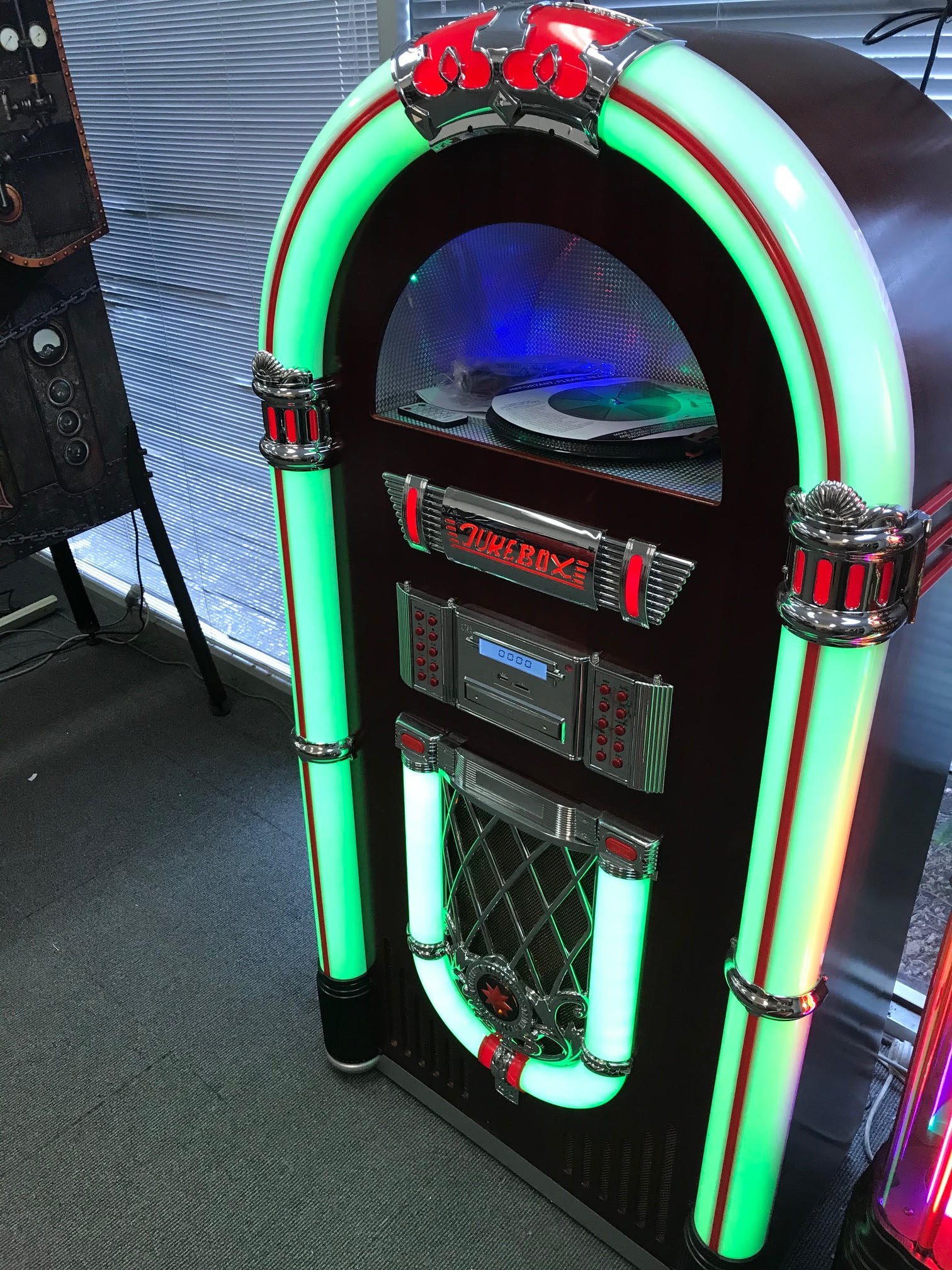 Plus for an additional cost you can add our accessory packs onboard and have a bonus Stand with storage to make the jukebox even bigger and add External speakers that are custom shaped to match the Jukebox.