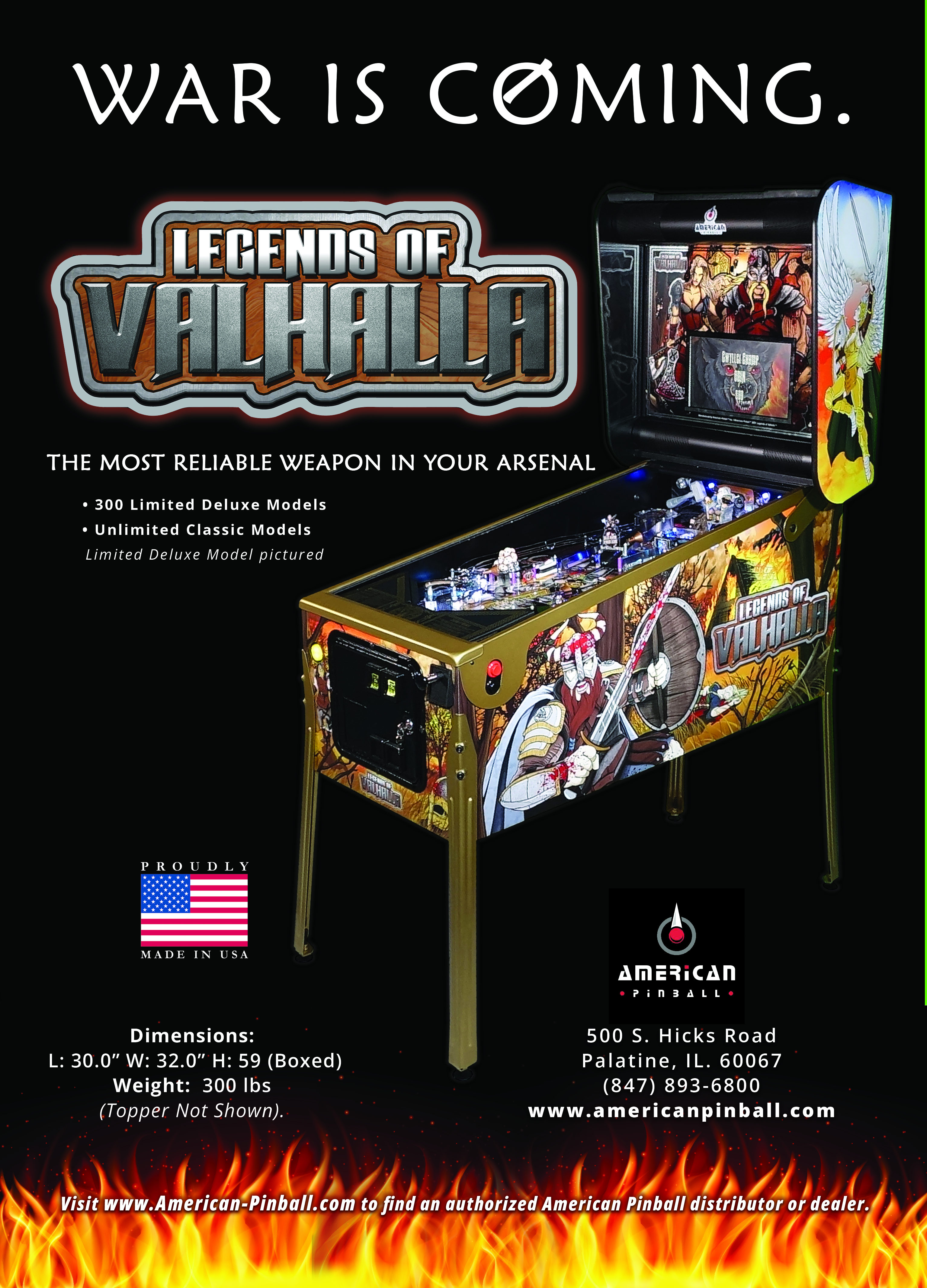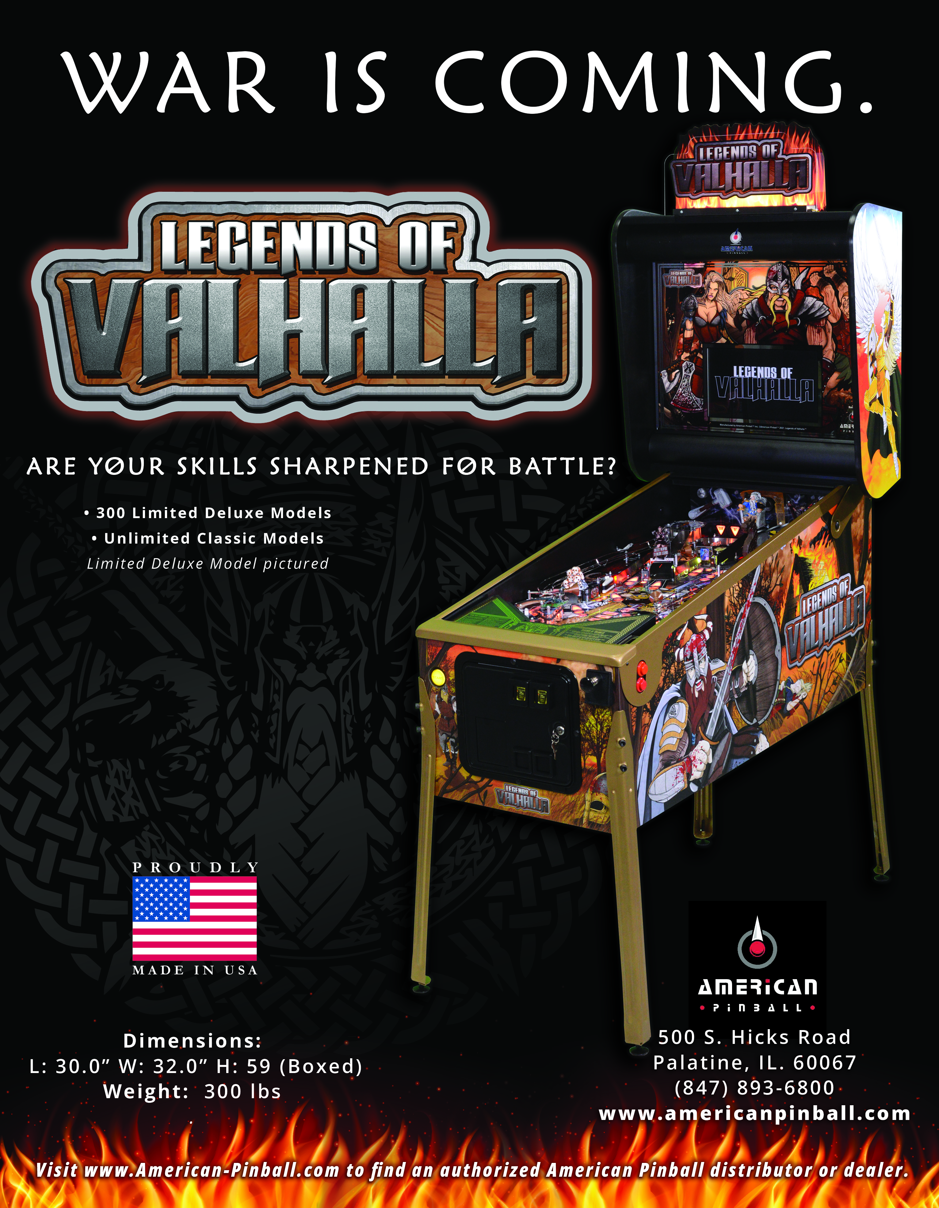 Legends of Valhalla, designed by Riot Pinball, is the 4th American Pinball title. Legends of Valhalla is an immersive pinball machine which brings the player into the world of the Norse gods and other Viking mythology. The game is a standard body design, utilizing three flippers offering a variety of fast and unique shots, including 3 metal ramps. The game rules have a variety of objectives that the player must either start or complete as they work their way through the game attempting to not only reach the wizard mode Valhalla, the majestic hall of dead Vikings, but also advance to the final epic battle known as Ragnarok, the super wizard mode.